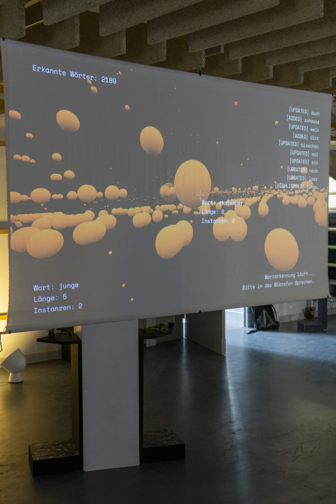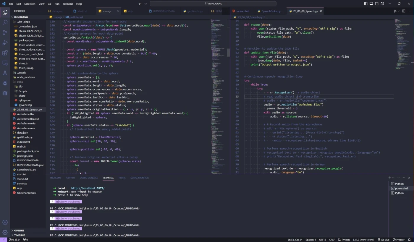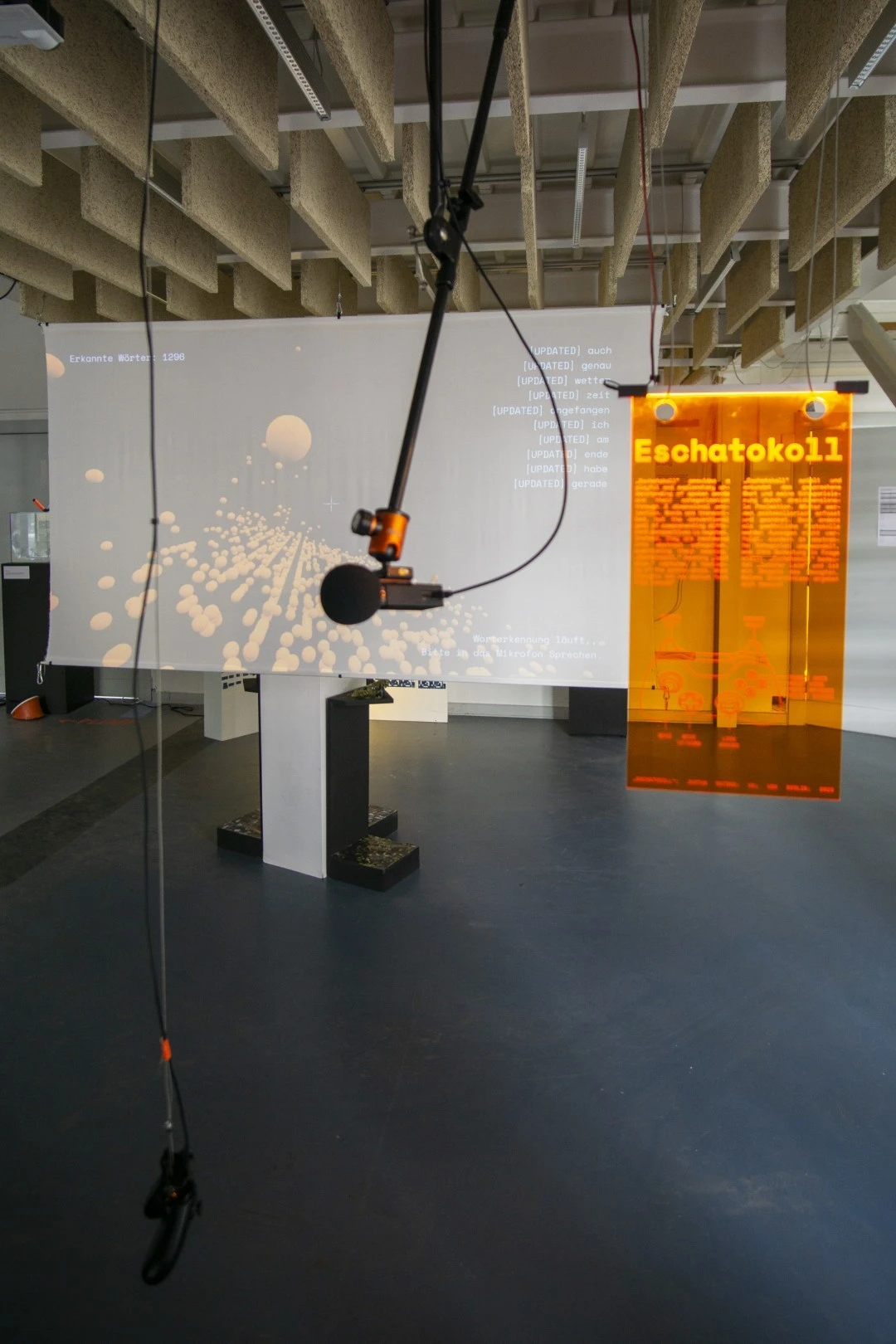 „Eschatokoll“ provides a playful and exploratory understanding of spoken words and their categorization through 3 dimensional projection. Words are transcribed, but the conventional goal of comprehending different perspectives is negated. Instead, they are reordered into abstract categories, questioning their meaning. „Eschatokoll,“ meaning „last glue,“ captures a testimony of the spoken words. What insights can we derive from this record?